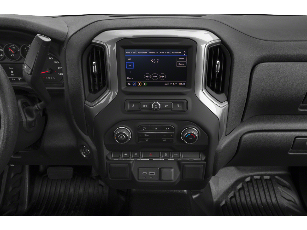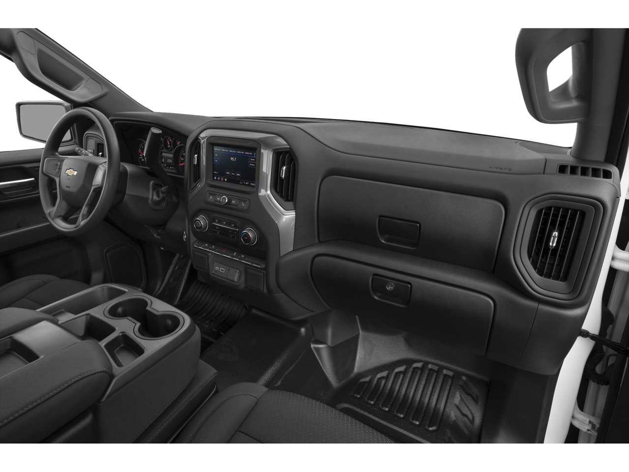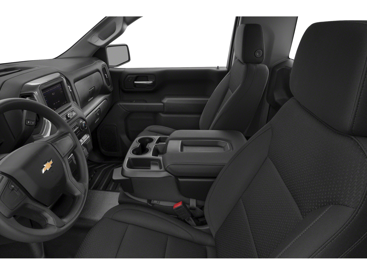 The Silverado's bold, muscular design is complemented by a sleek Black exterior that exudes confidence. Inside, the spacious cabin offers a comfortable and well-appointed environment, with features like a 40/20/40 front split bench seat, rubberized-vinyl floor covering, and a 3.5 monochromatic driver information center.